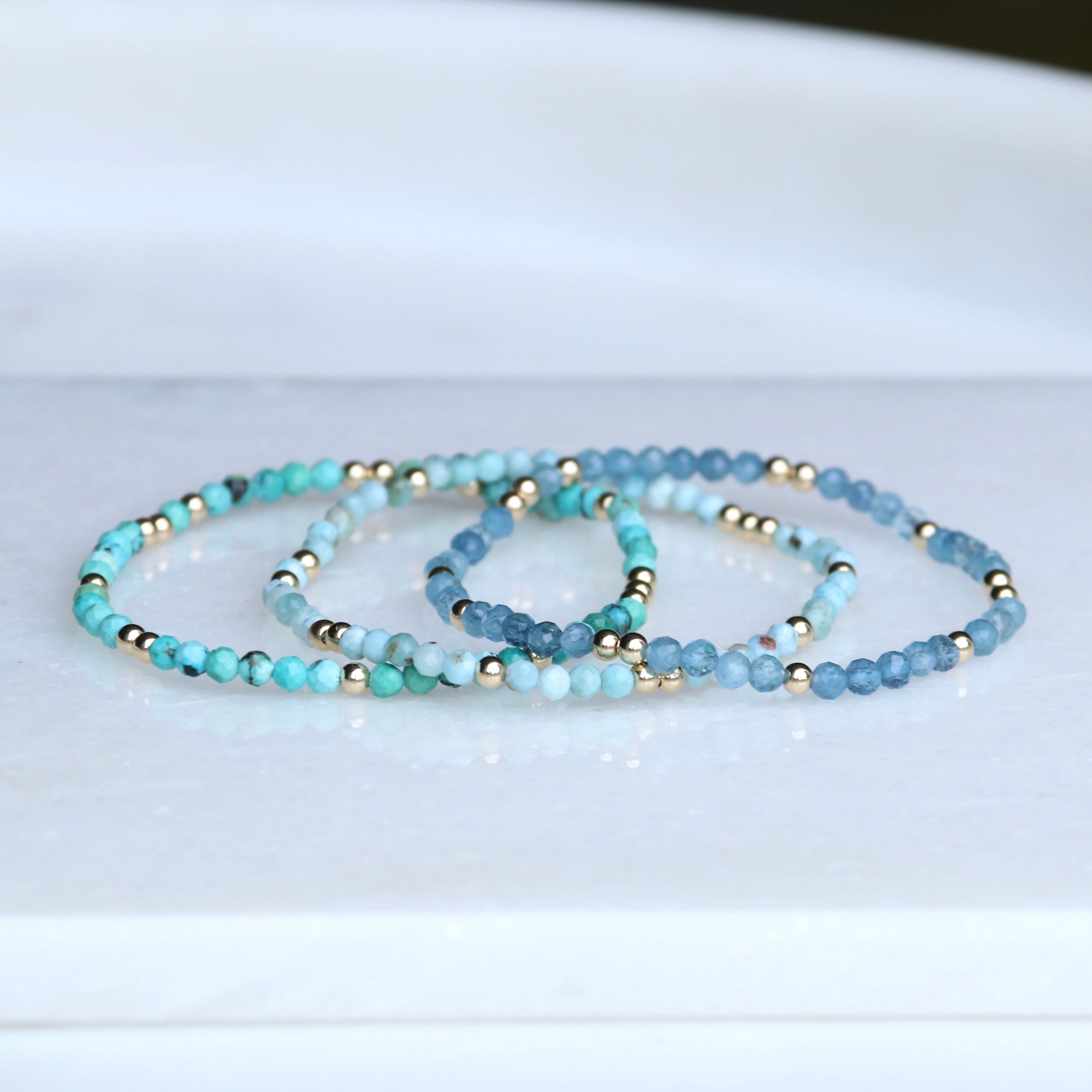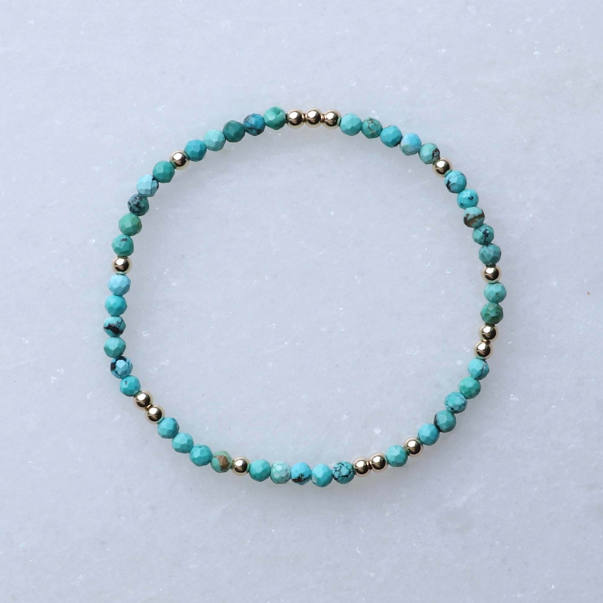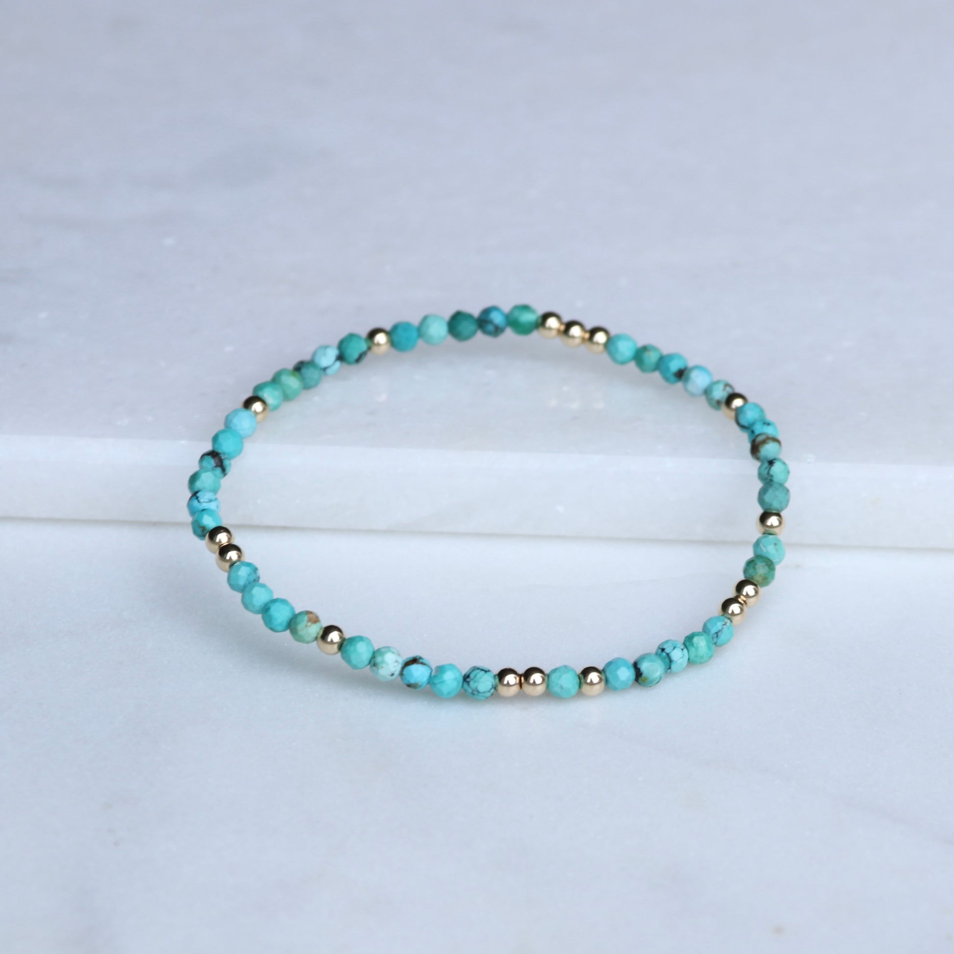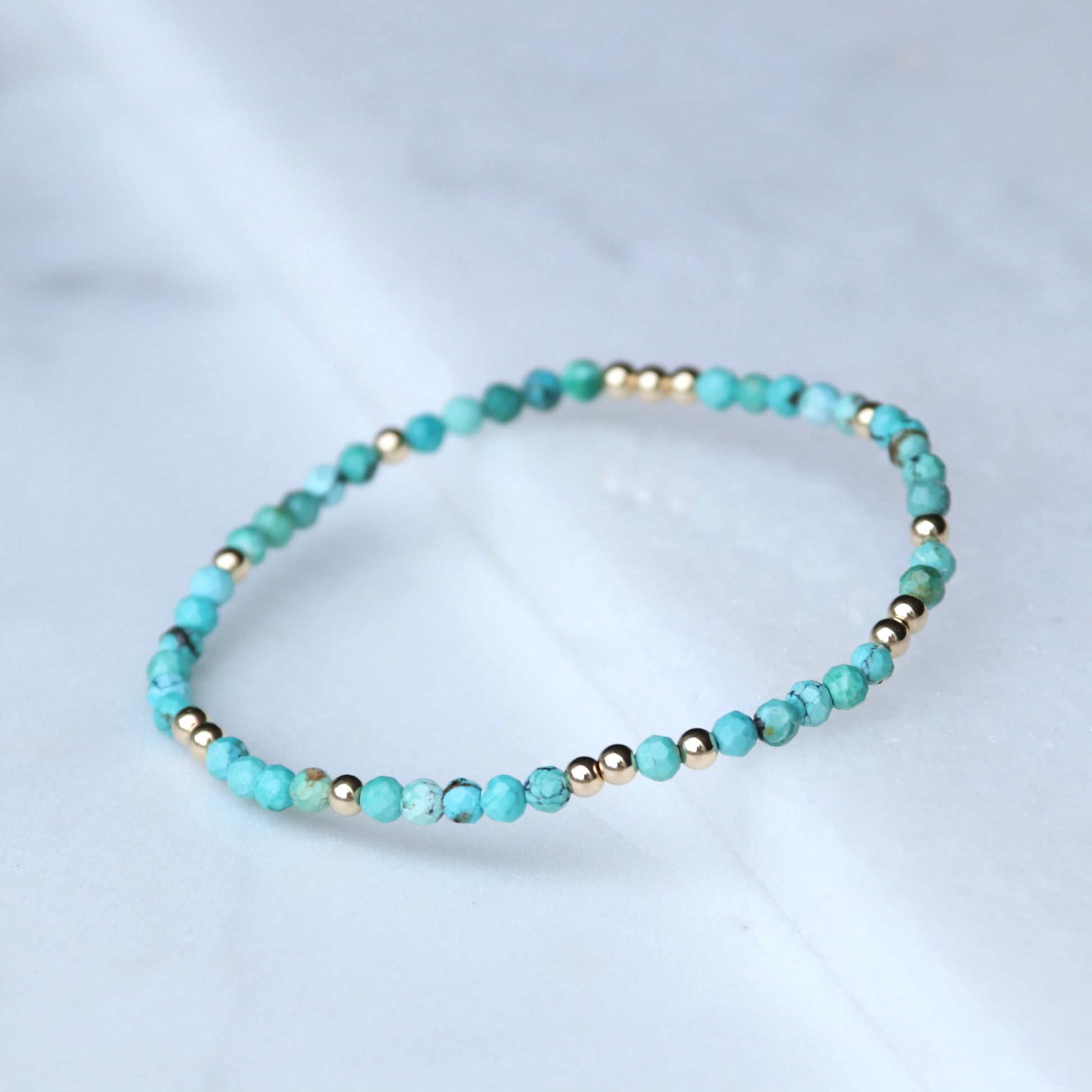 These bracelets are handmade using 3mm 14k Gold Filled beads and beautiful, bright, 3.5mm Arizona Turquoise Genuine Gemstones.