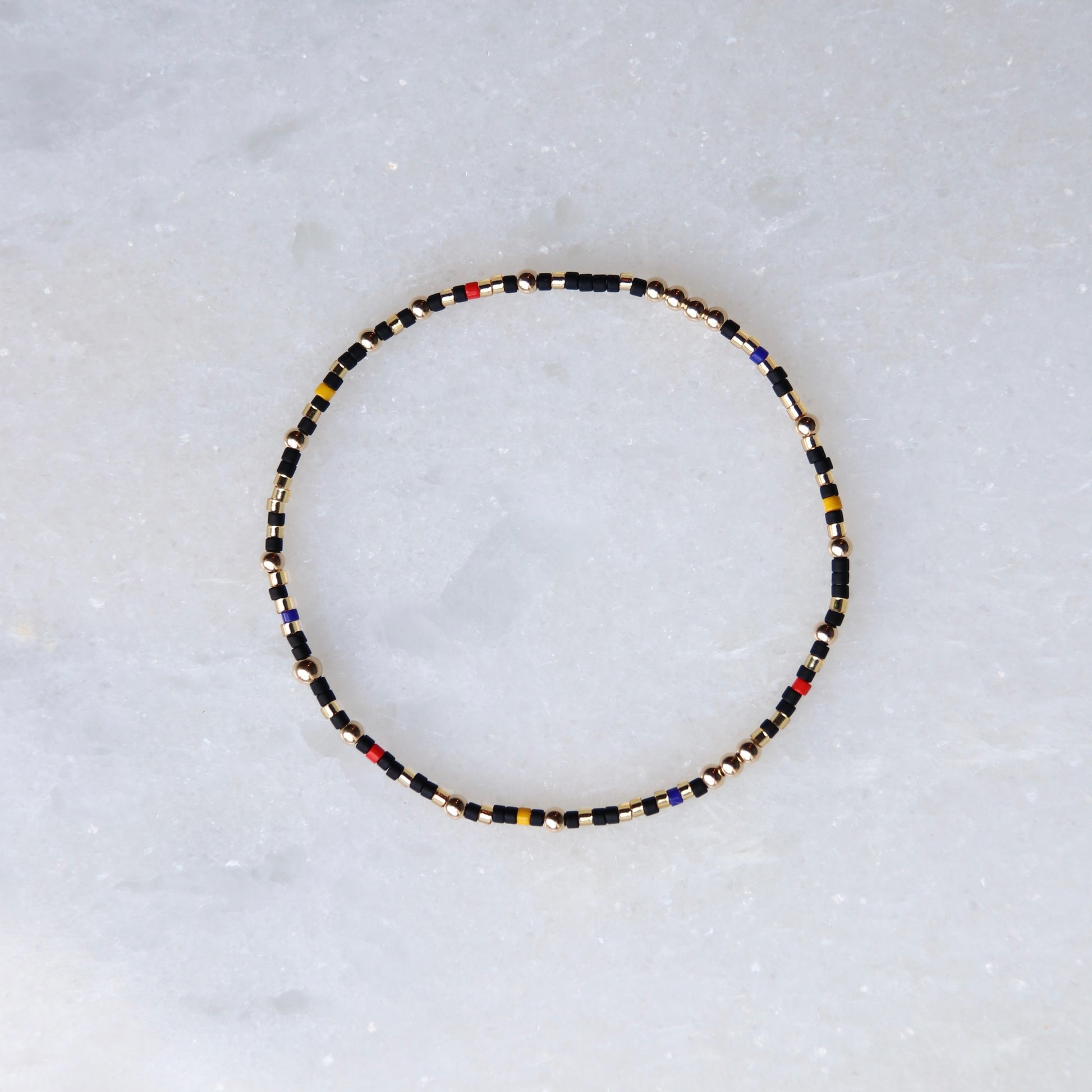 Show your Steelers pride with this handcrafted bracelet featuring the team’s iconic black and gold colors, accented with luxurious 14k gold-filled beads. A subtle sprinkle of red, yellow, and blue beads pays homage to the team’s signature logo, representing the three astute steel-industry symbols on the Steelers crest.