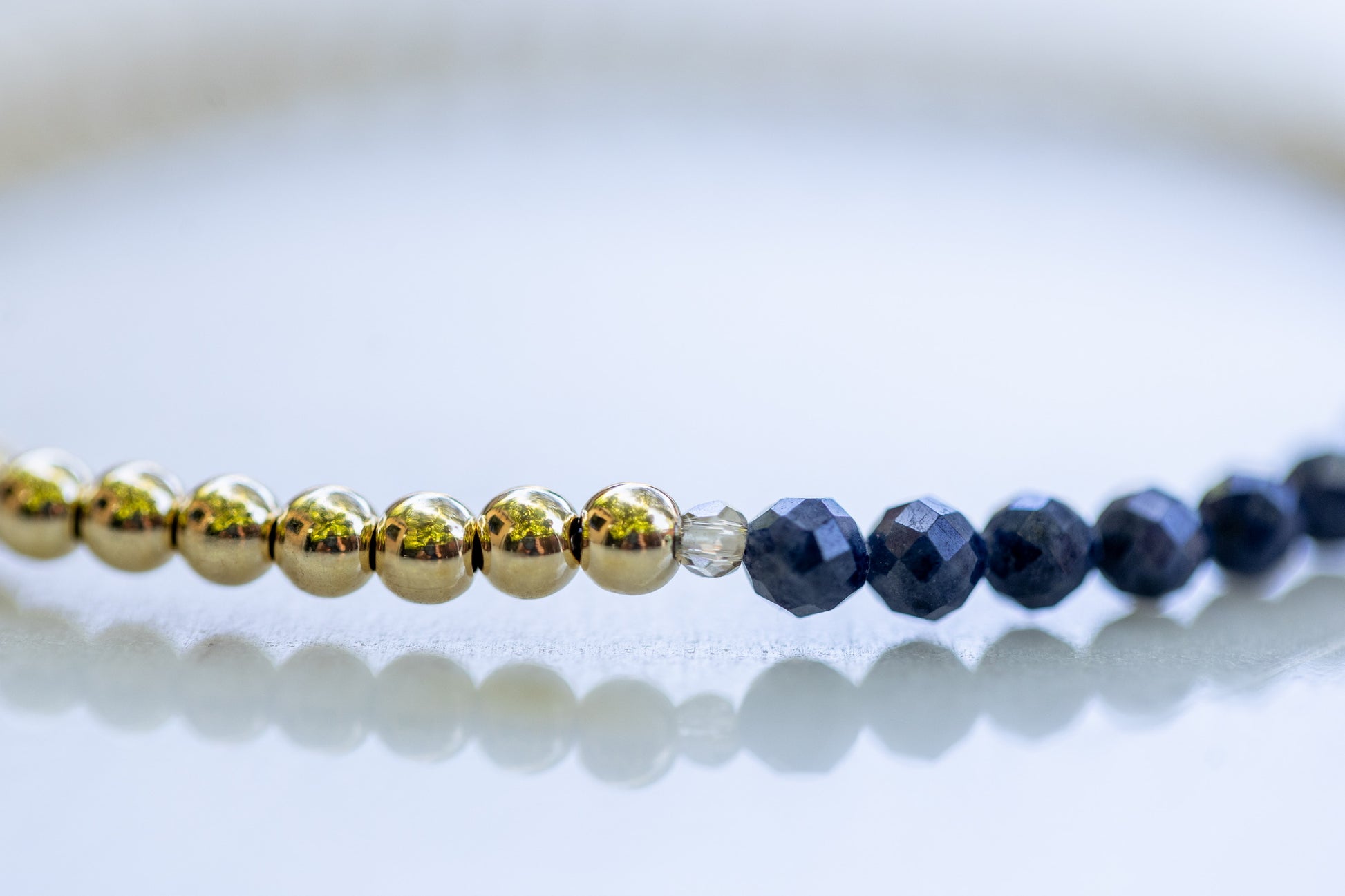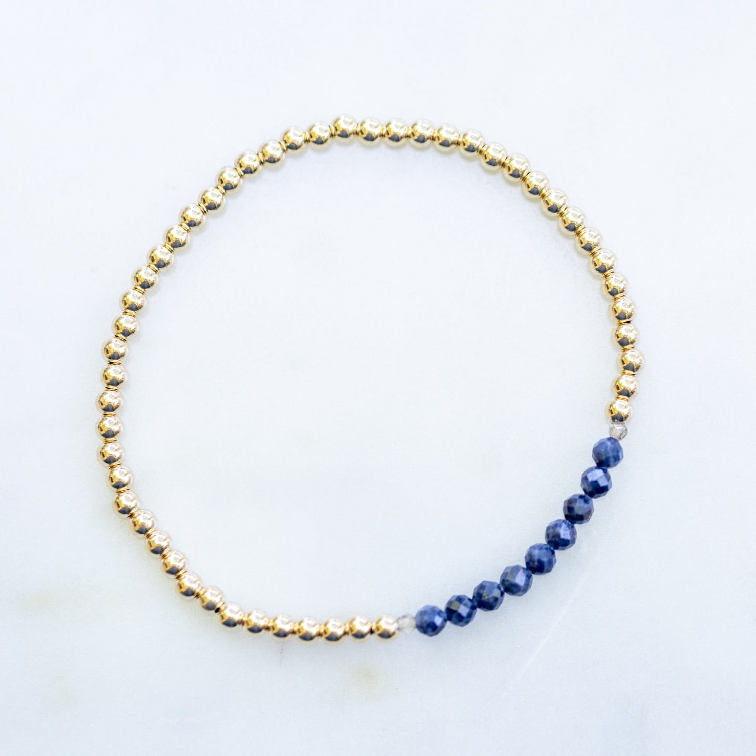 These bracelets are handmade using 14k Gold Filled beads featuring a gorgeous centerpiece of Natural Sapphire stones and two 2mm crystals on each side.