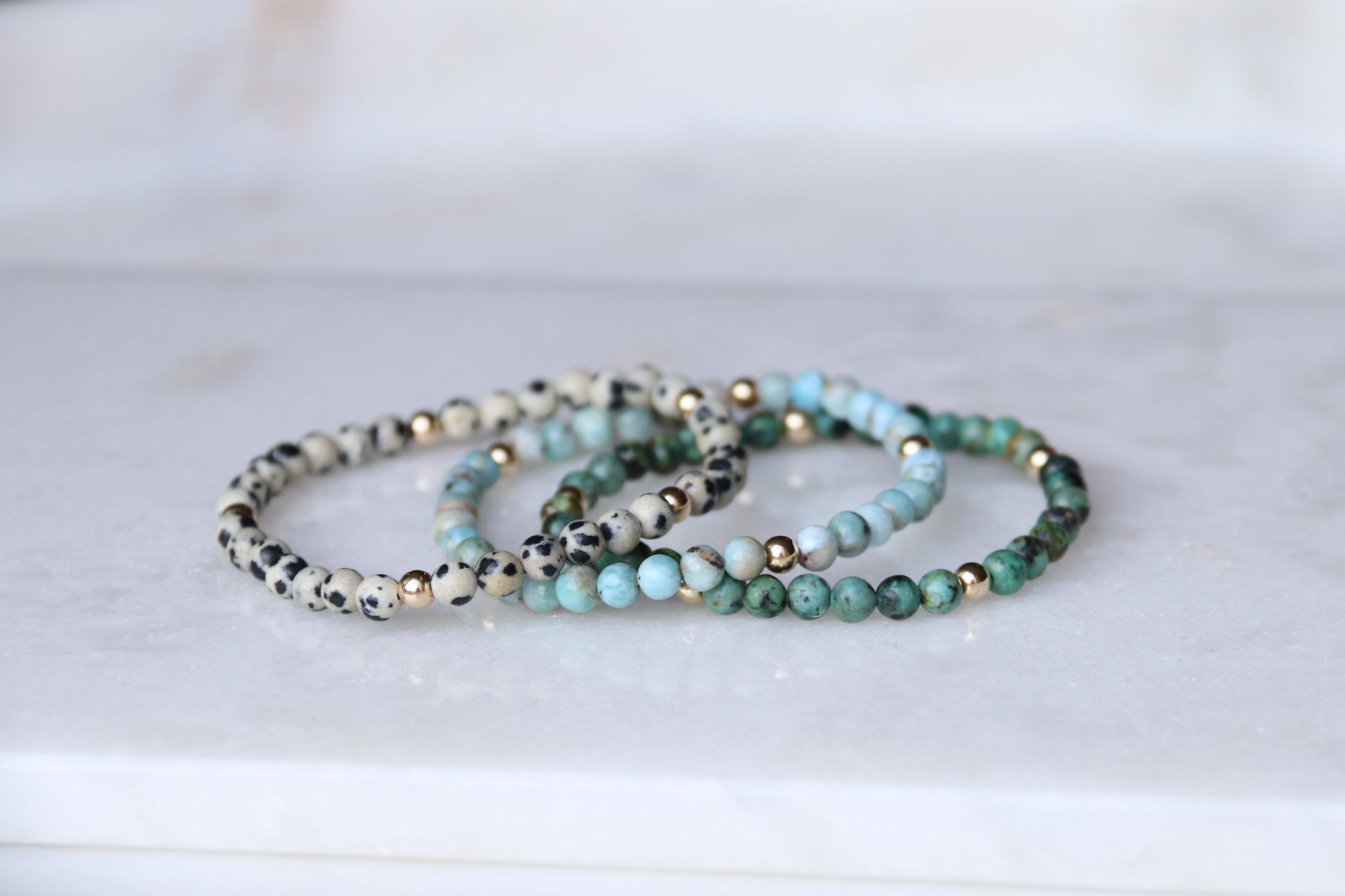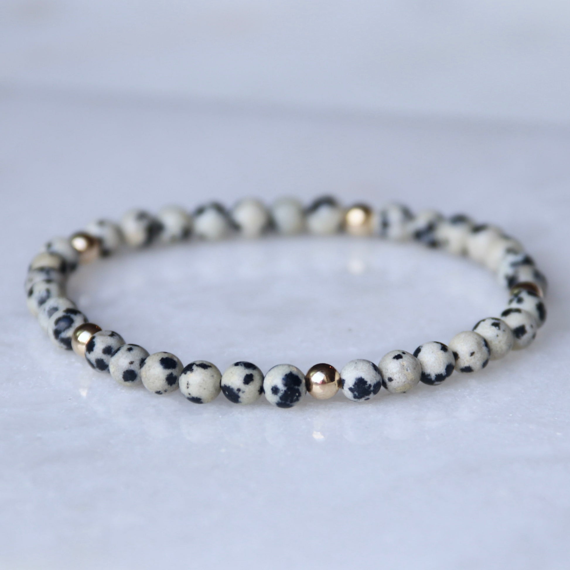 These bracelets are handmade using 4mm 14k Gold Filled beads and Dalmation Jasper Gemstones.