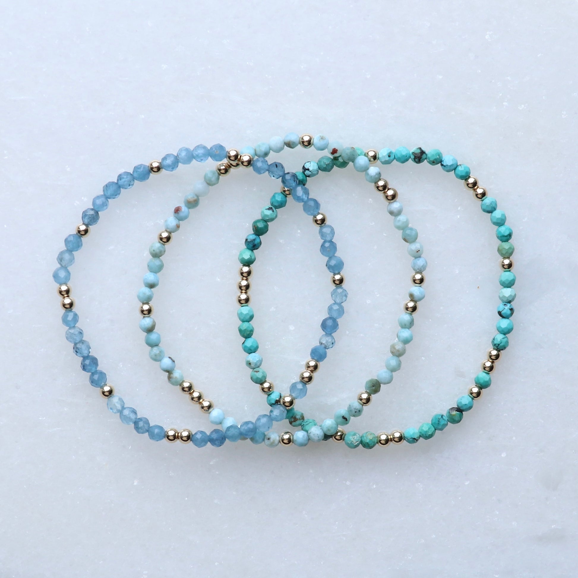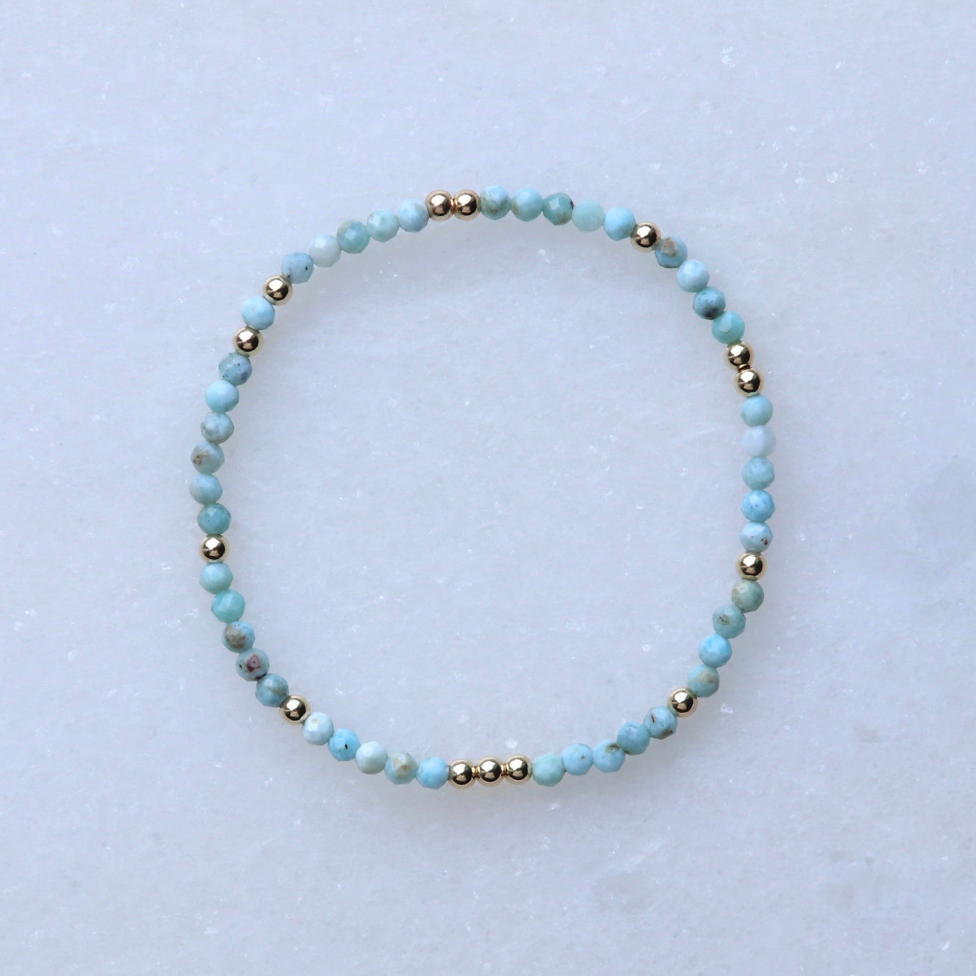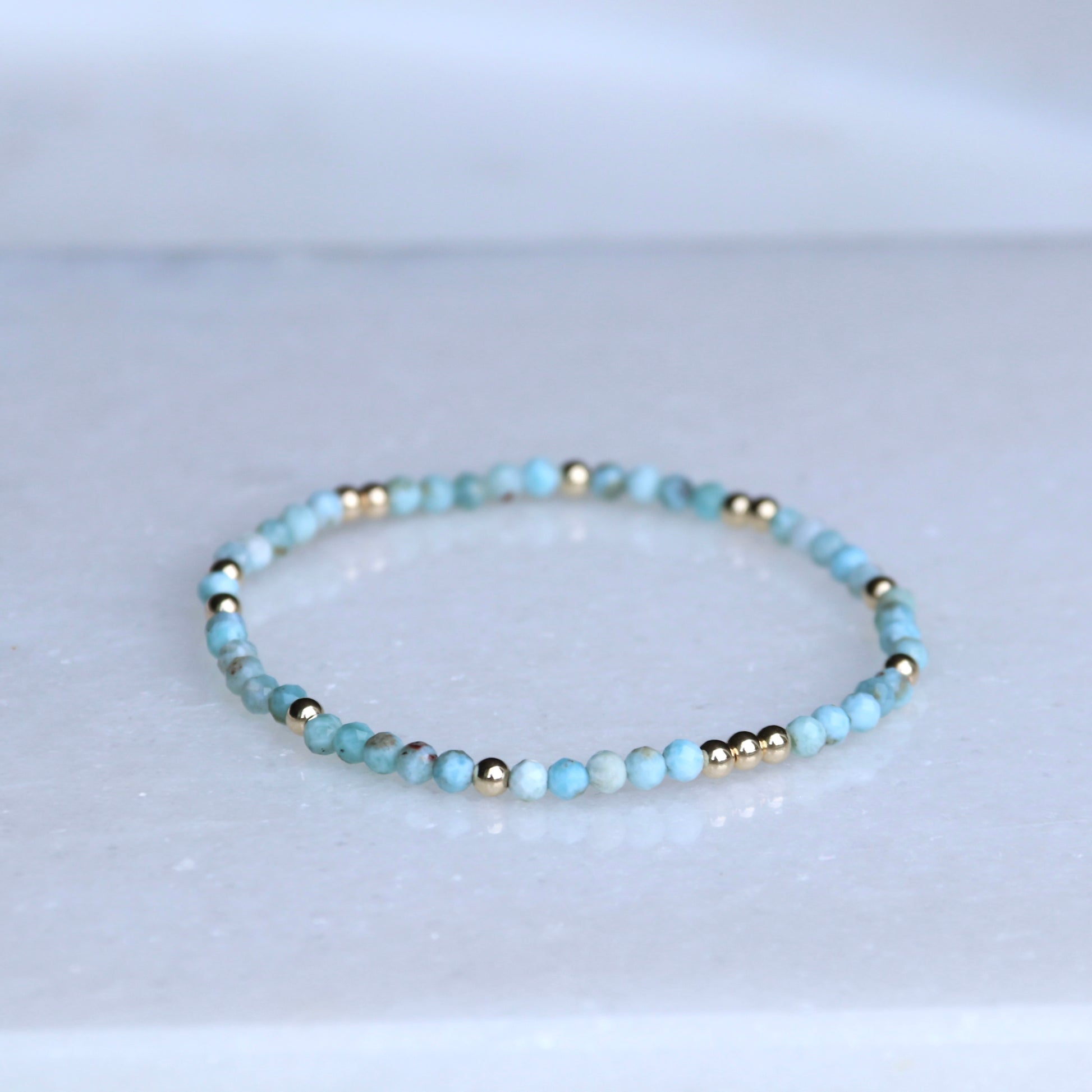 These bracelets are handmade using 3mm 14k Gold Filled beads and beautiful 3mm Dominican Larimar Gemstones.