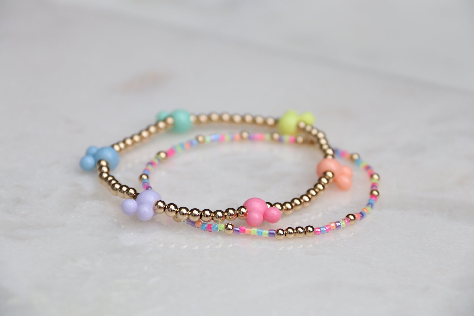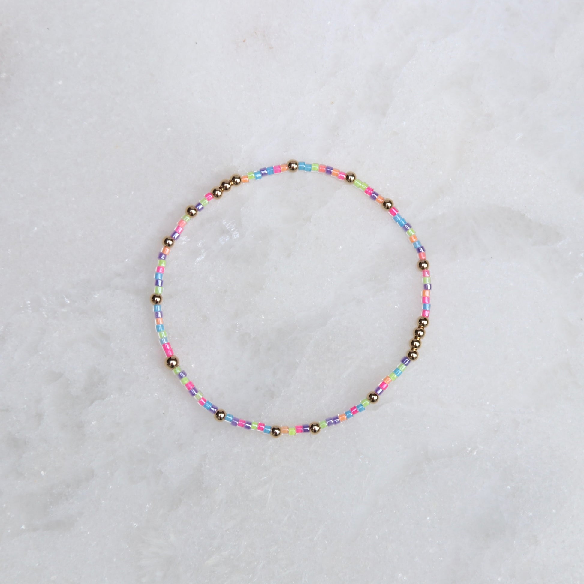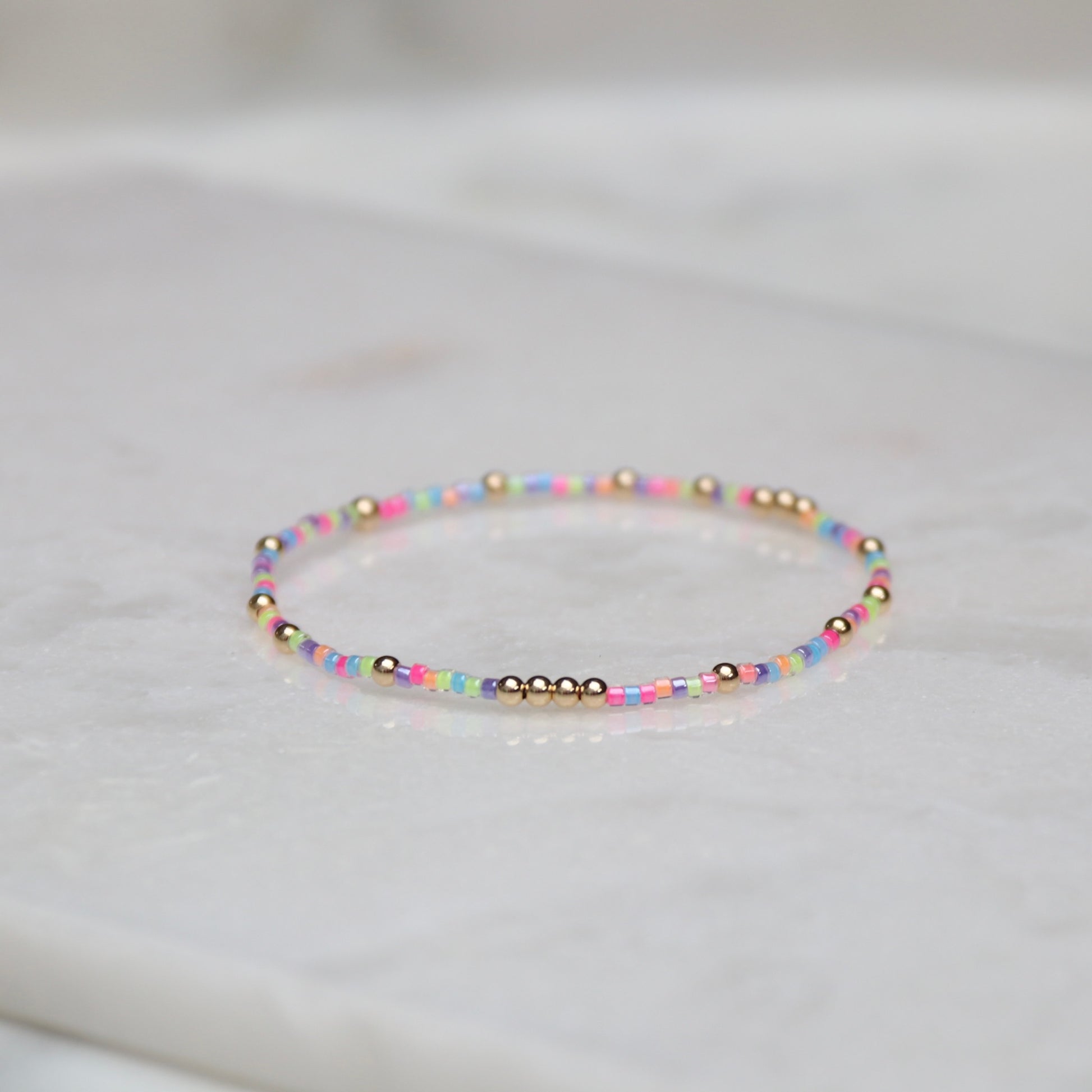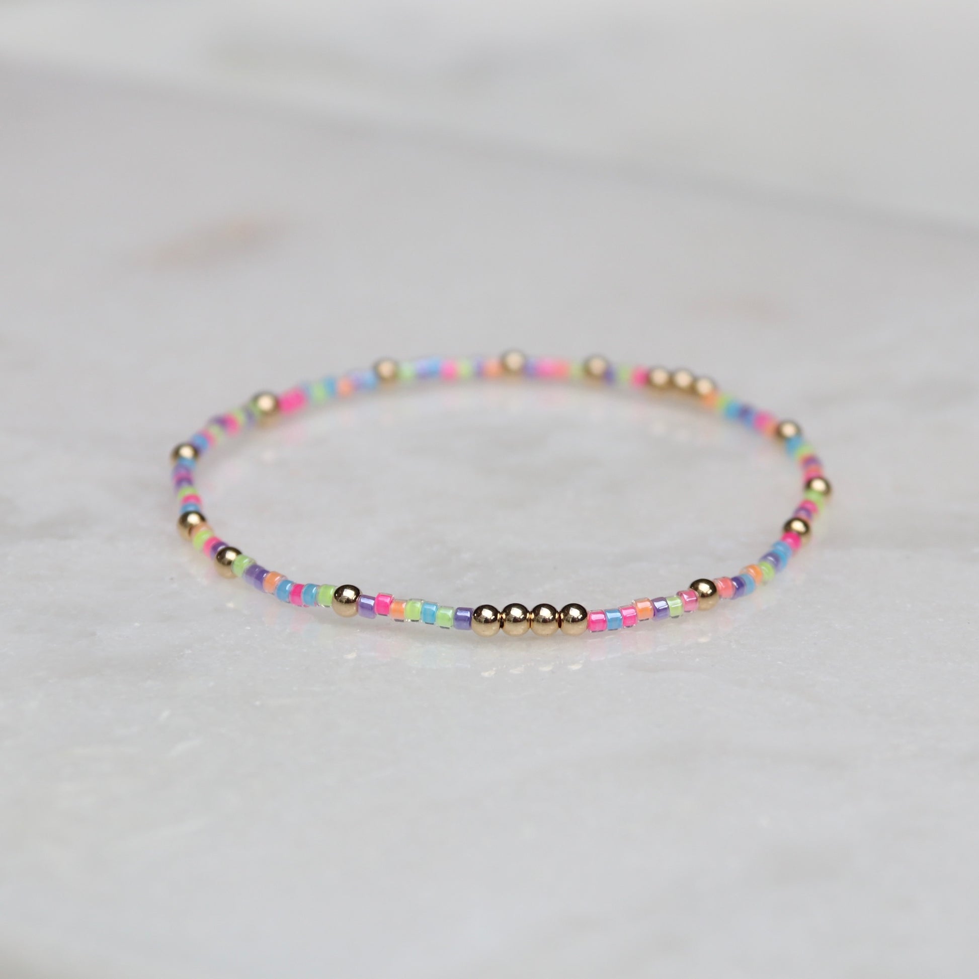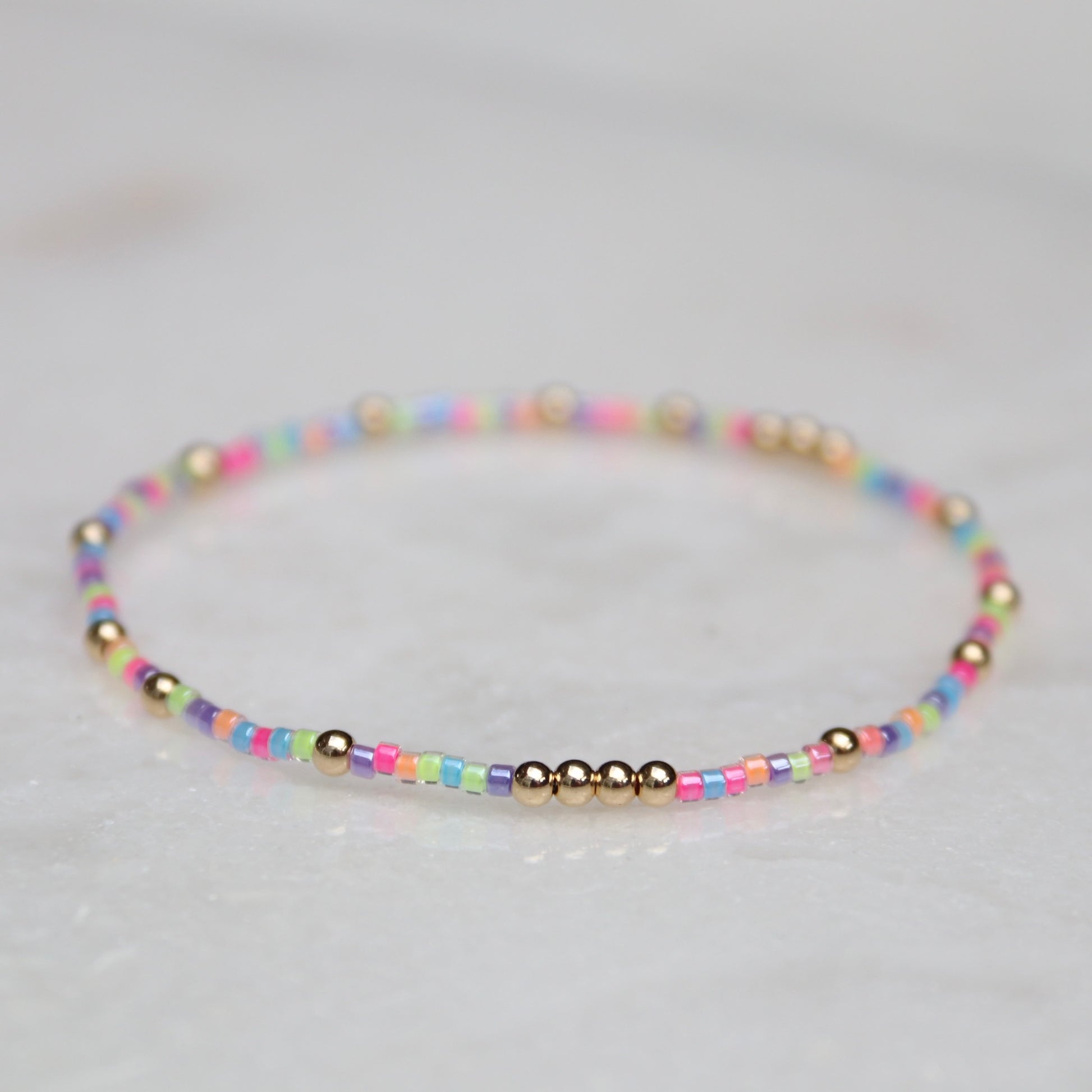 Each bracelet is meticulously beaded by hand using seed beads and 14k Gold Filled beads. Each bracelet is unique, please allow for slight variations.