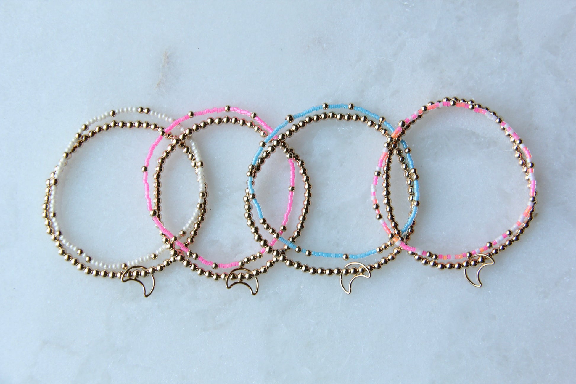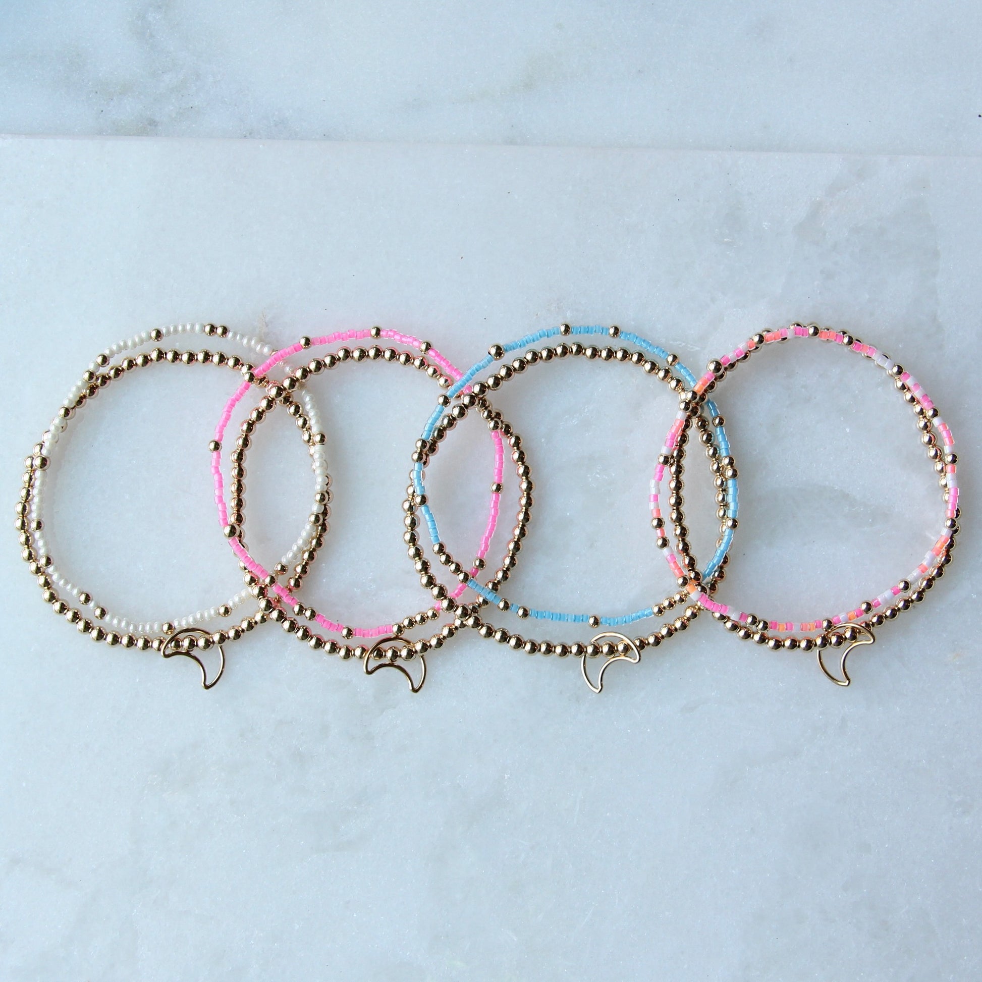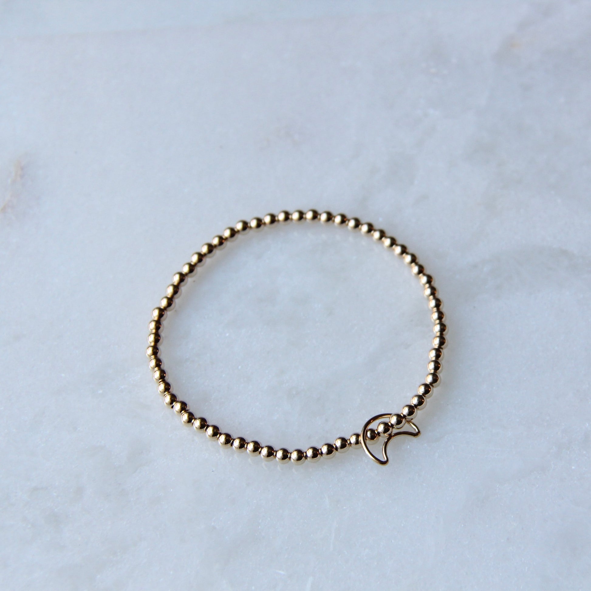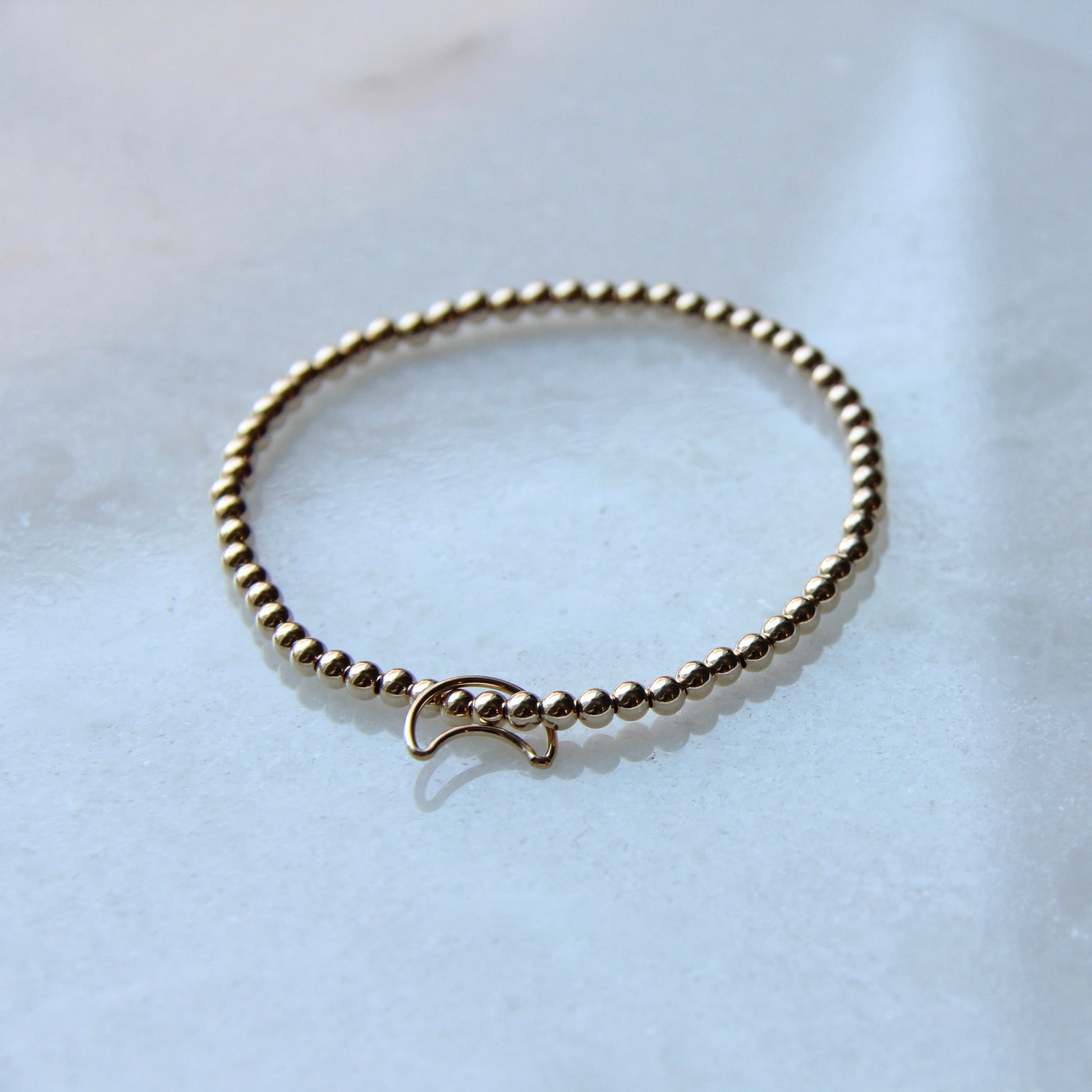 Crafted with 3mm 14k Gold Filled beads, each bracelet is adorned with a stunning 14k Gold Filled floating moon charm for a timeless and elegant look.