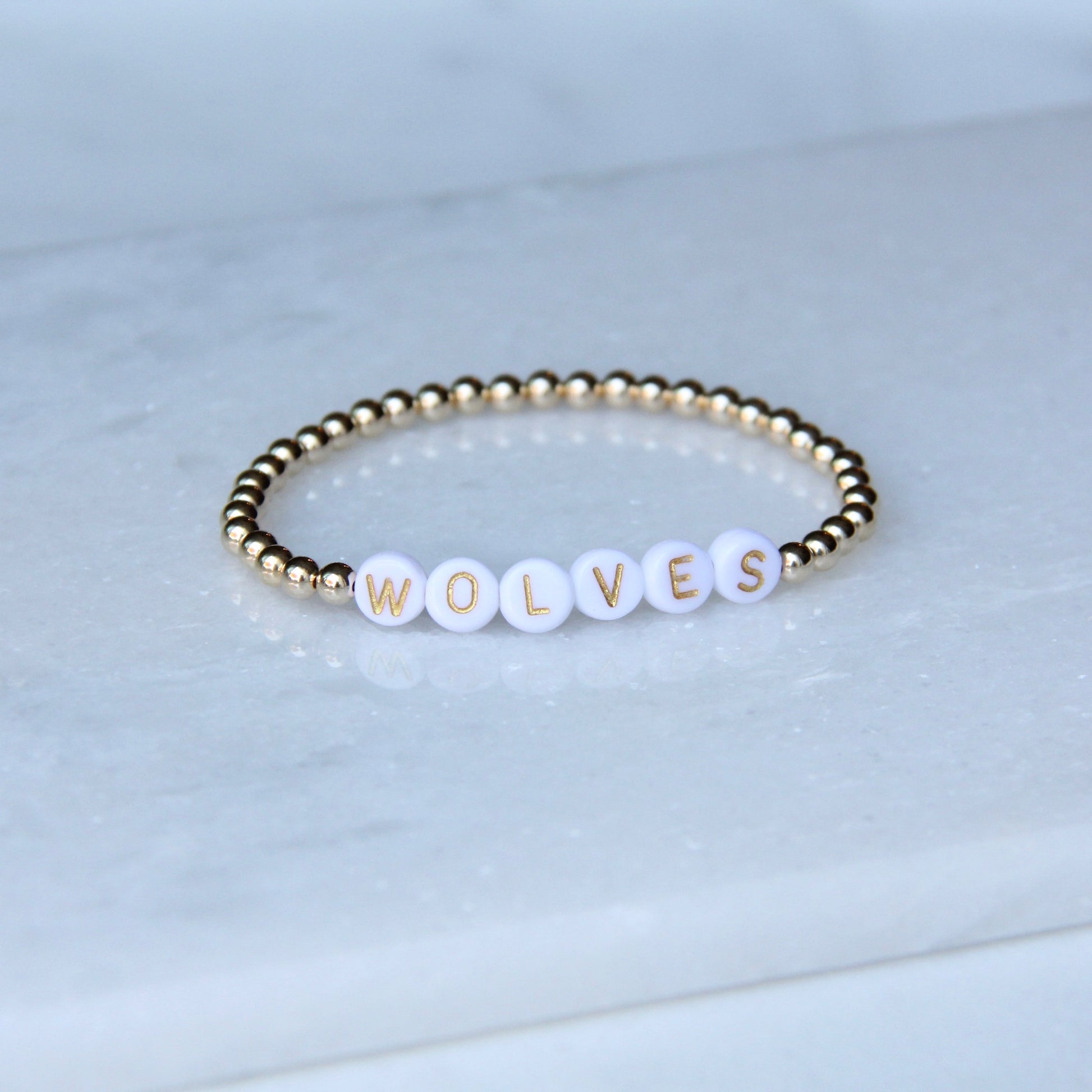 - "WOLVES" white acrylic beads with gold letters